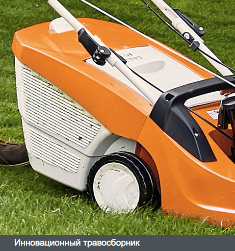 Удобство использования. Травосборник объемом 40 л оснащен индикатором для удобства контроля за его заполнением.