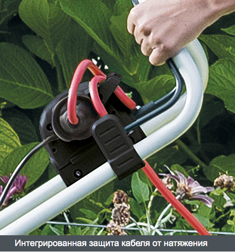 Высота скашивания удобно регулируется в диапазоне от 25 до 85 мм при помощи подпружиненного механизма.