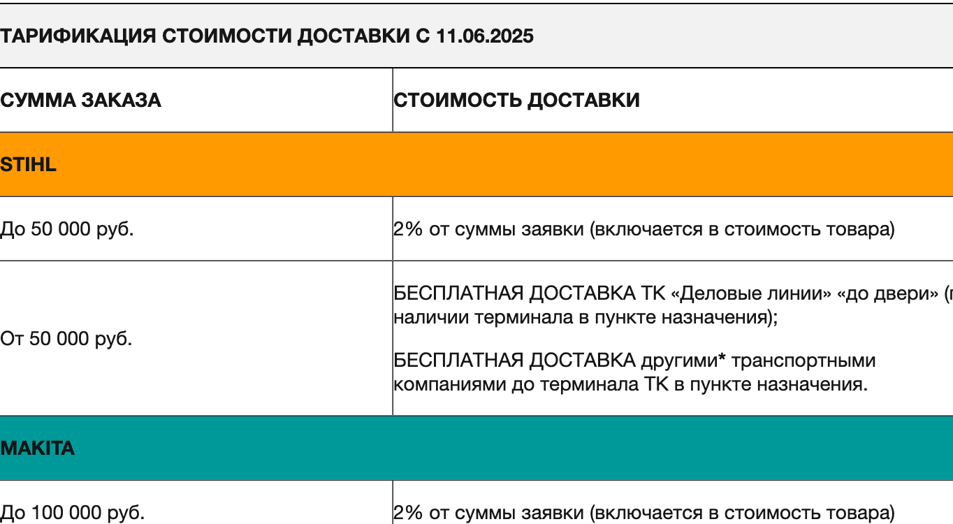 ТАРИФИКАЦИЯ СТОИМОСТИ ДОСТАВКИ С 11.06.2025 |